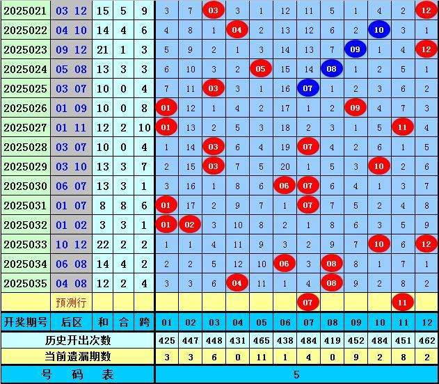 后区分析(定义:01-04为一区,05-08为二区,09-12为三区):上期后区开出奖号04和08,分别出现在第一区和第二区和区,最近10期后区三个区间落号个数比为8:7:5,本期后区注意第二区和第三区号码出现,关注两码07、11。