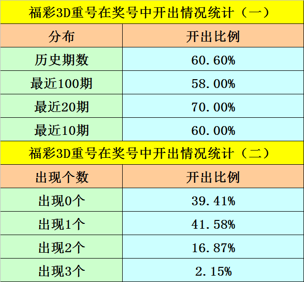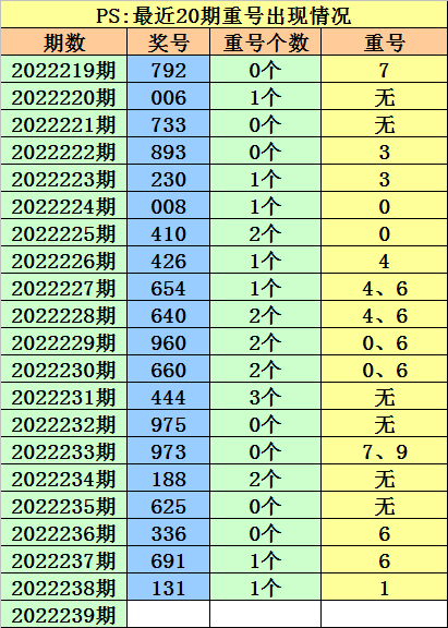 最近100期开奖中,含有重号的奖号有58期,最近20期含有重号的奖号有14期,最近10期含有重号的奖号有6期。本期排除重号。