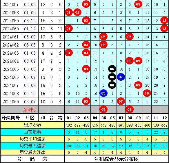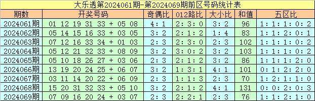 上期回顾:大乐透第2024069期奖号为:07 09 16 20 24 + 03 07,其中前区奇偶比2:3,012路比2:2:1,大小比2:3,和值76,五区比1:1:2:1:0。