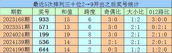 1、最近两期排列三十位号码开出号码分别为2和9,历史上十位号码连续两期同时出现号码2和9的奖号共开出69期。最近五次下期开出号码为:933、571、199、536、644;