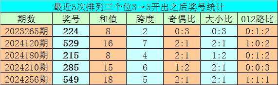 1、排列三前两期个位分别开出号码3和5,历史上个位号码连续两期分别出现3和5时,共有63次。在最近5次出现时,其下期分别出现号码:224、529、215、285、549;