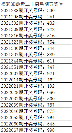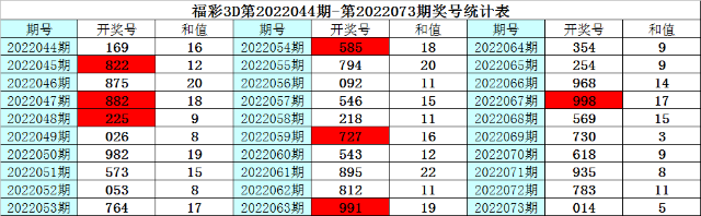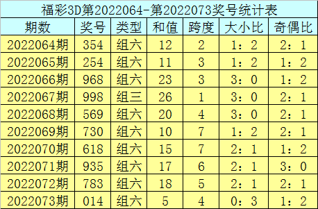 上期回顾:福彩3D第2022073期奖号为:014,其中奖号组选类型为:组六,奇偶比为1:2,大小比为0:3,012路比为1:2:0,和值为5,跨度为4。