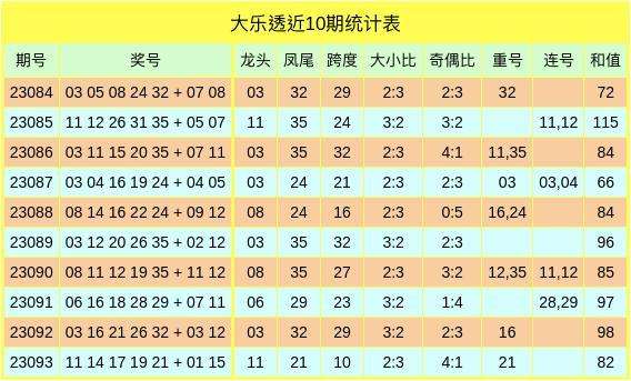 上期开奖评析,大乐透第23093期奖号为:11、14、17、19、21 + 01、05,前区跨度为10,和值为82,开出1枚重号21,无连号。