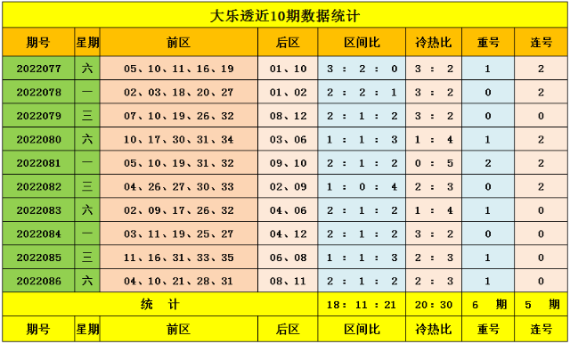 后区近10期大小比为10:10,大、小号码走势相同,上期开出大大组合,本期后区推荐小大组合;