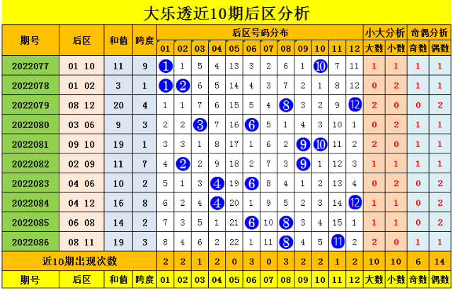 后区近10期奇偶比为6:14,偶数走势稍热,上期开出偶奇组合,本期关注奇奇组合。