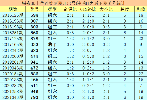 十位号码:前两期十位分别出现奖号0-1,历史上福彩3D连续前后分别开出号码0-1的现象共开出78次。在十位0-1的现象出现时,最近15期其下期分别开出号码:594-907-303-860-878-333-623-474-941-472-886-465-511-946-793;
