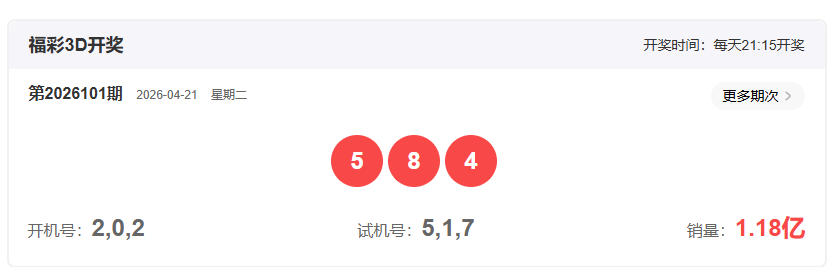 福彩3D第2026101期开奖号码为584,形态为组六,奇偶比1:2,和值:17,跨度4,大小比2:1,【012路个数比】0:1:2。