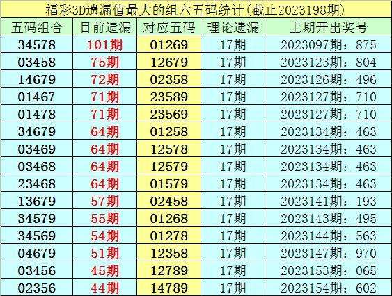 3。福彩3D第23198期10个遗漏最大的五码组六开出2个。