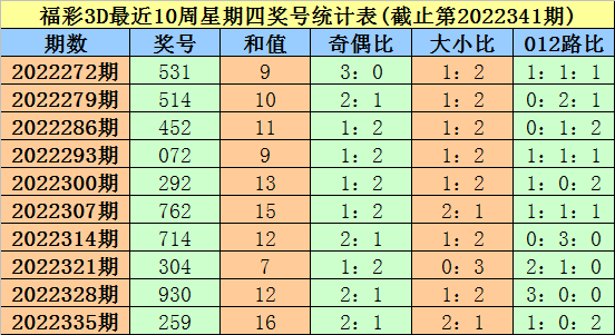 福彩3D第2022335期(上周星期四)奖号为259。其中奖号奇偶比为2:1,大小比为2:1,012路比为1:0:2。