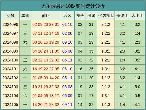 上期回顾:大乐透第2024105期:前区14、20、21、28、32;后区09、11,其中前区012路比为1:1:3,奇偶比为1:4,后区开出奇数号码09、11。