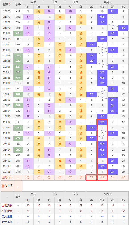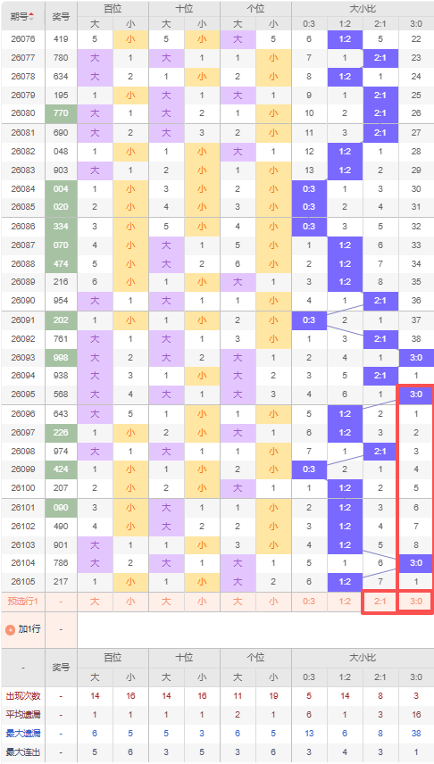上期大小比:1:2,近10期大小比出现情况:1:2、1:2、2:1、0:3、1:2、1:2、1:2、1:2、3:0、1:2,最近10期出1期2:1,出现7期1:2,出现1期0:3,出现1期3:0,根据近10期出号规律本期推荐遗漏7期的2:1,防隔期出3:0,综上所述大小比推荐:3:0,重点关注:2:1。