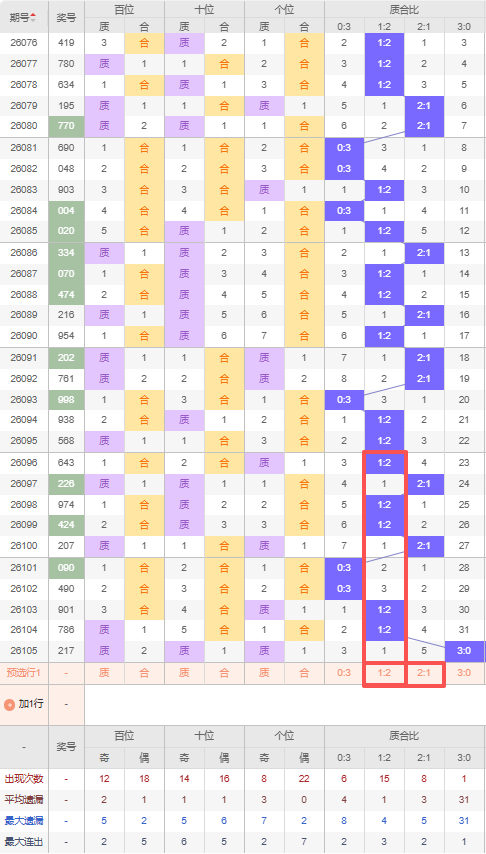 上期质合比:3:0,近10期质合比出现情况:1:2、2:1、1:2、1:2、2:1、0:3、0:3、1:2、1:2、3:0,最近10期出现2期2:1,出现5期1:2,出现2期0:3,出现1期3:0,根据近10期规律本期推荐隔期出的1:2,防遗漏5期出2:1,综上所述质合比推荐:2:1,重点关注:1:2。