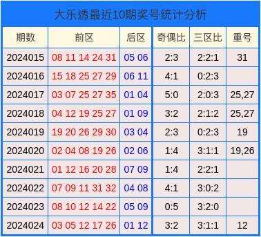 开奖回顾:大乐透第2024024期奖号:03、05、12、17、26+01、12。其中奇偶比为3:2,三区比为3:1:1,开出1枚重号12。