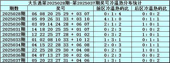 体彩大乐透第25037期奖号为:05 20 23 27 31+04 06,前区奖号奇偶比为4:1,012路比为1:1:3,大小比为4:1,遗漏总值为31,后区号码遗漏总值为1。