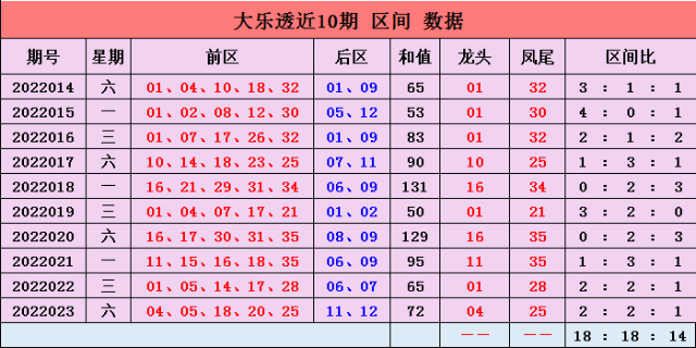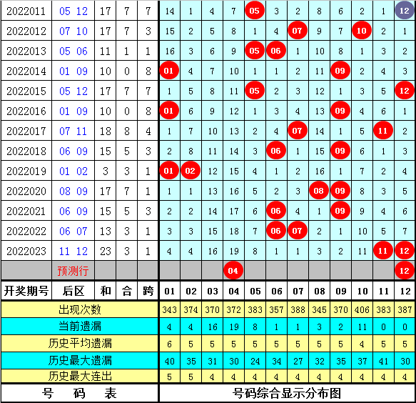 后区分析:上期后区奖号为11+12,本期后区注意重复号码出现,大范围参考号码02、04、05、12。