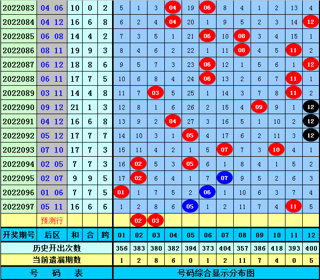 后区分析:上期后区奖号为05和11,最近5期后区和值分别为17、7、9、7、16,后区跨度分布范围在3-6,本期后区注意两码02、03。