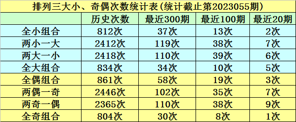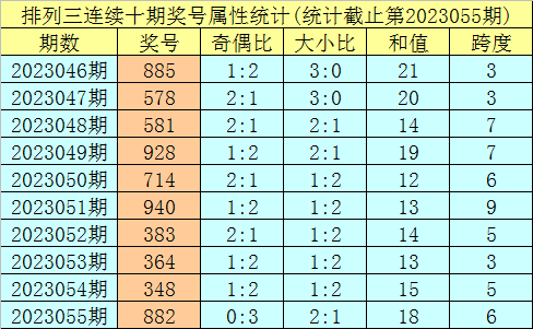 上期回顾:排列三第2023055期奖号:882。类型:组三,奇偶形态:偶偶偶,大小形态:大大小,和值:18,跨度:6。