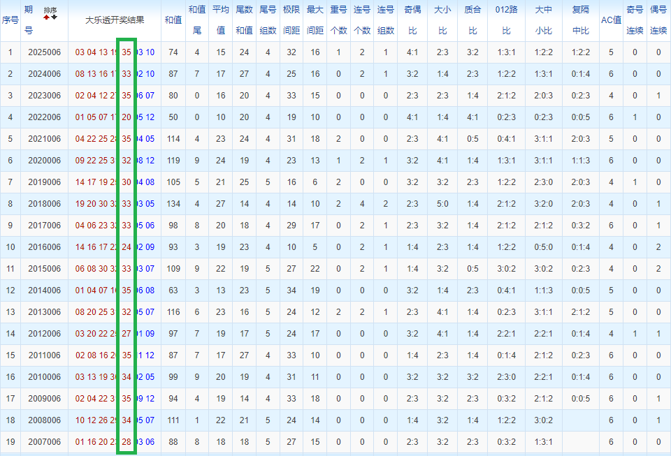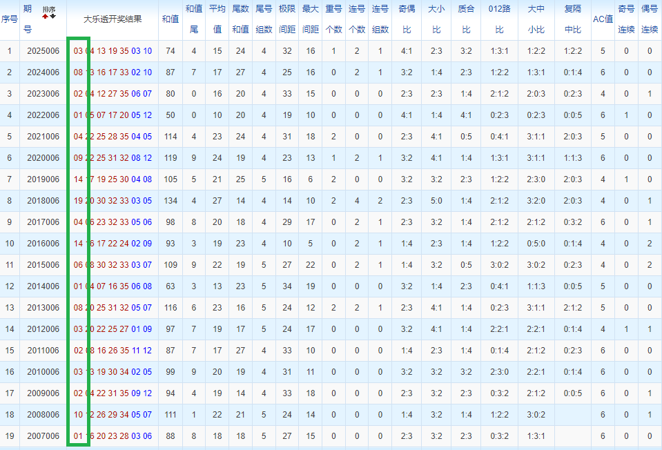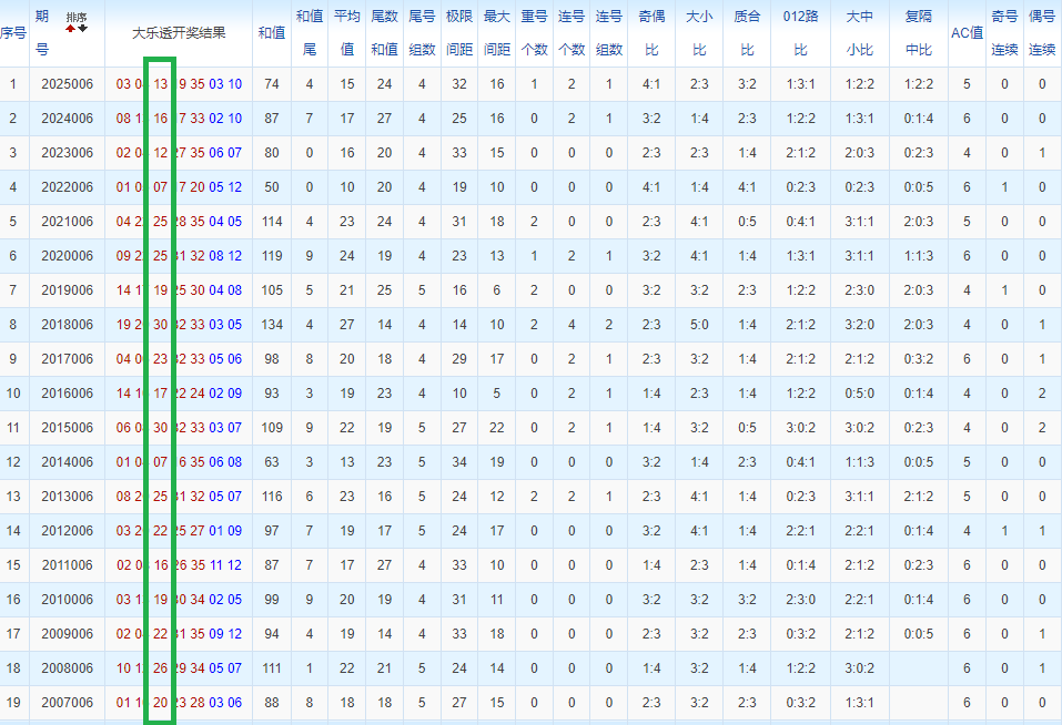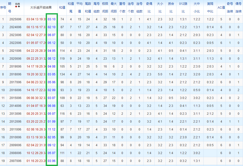 通过观察,我发现往年同期的开奖数据与本期号码之间存在显著关联。具体来说,在前区号码中,从第一位至第五位,通常会有约三个位置上的数字与往年同期相同位置的号码一致;而后区号码中,也有多期开奖结果直接包含了往年同期的数字。因此,我们可以借助往年同期各位置上的号码,作为分析本期开奖情况的重要依据。在此基础上,还可结合往年同期的其他相关条件,进行综合性的号码组合推荐。
