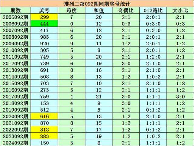 号码跨度:在第093期同期奖号中,跨度开出频次分别为:跨度8开出4期,跨度3、6、7开出3期,跨度2、4、5开出2期,跨度0、1、9没有出现。去年同期开出3,今年同期预计跨度上升,注意跨度6。