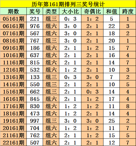 历年第162期奖号中:组三开出3次,组六开出14次。组三较少,本期注意组三反弹。