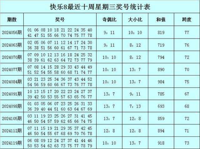 福彩快乐8第2024119期(上周三)开奖回顾:06 08 09 12 24 27 37 41 44 46 50 53 54 62 63 73 75 77 78 79,其中奖号和值为918,跨度为73,奇偶比为10:10,大小比为13:7。