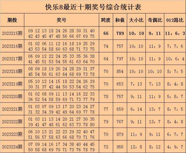 福彩快乐8第2023224期开出奖号:07 09 14 16 17 34 38 40 44 45 50 58 68 69 70 71 73 76 78 79,其中奖号跨度开出72,和值开出956,大小比开出12:8,奇偶比开出8:12,012路比开出4:9:7。