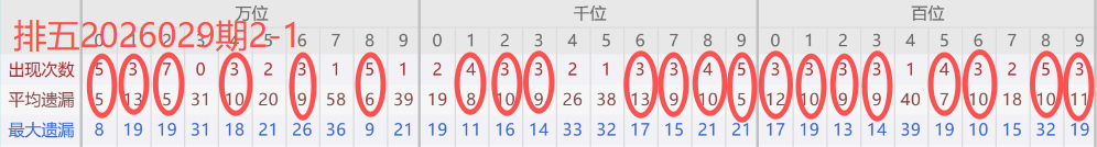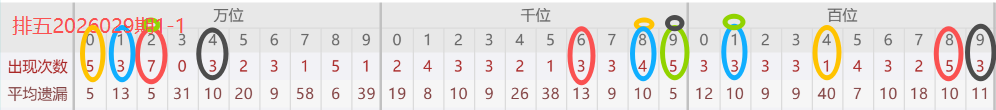 下图所圈出的为近30期各位置所出现的热码出现次数及平均遗漏值,用以参考和一些冷码组合选号。