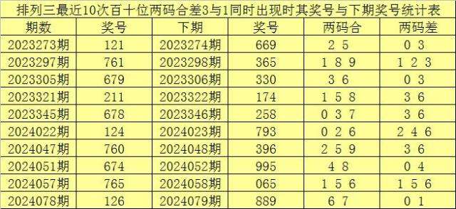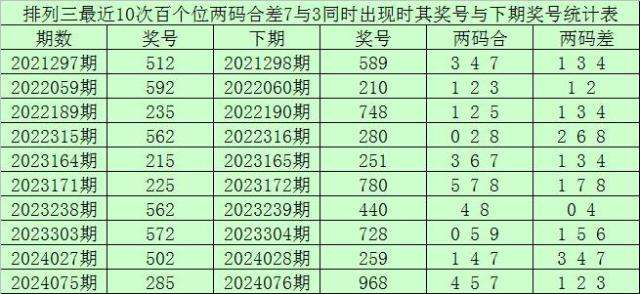 从以上统计可以看出,百个位两码合差7与3同时出现之后其下期两码合差表现最热的4个分别为:1347,本期百个位两码合差可以参考这四码中的数据。