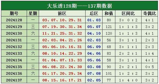 大乐透第2024137期出奖号统计:前区08、15、16、17、21,后区02、05。和值为77,区间比为1:4:0,奇偶比为3:2。