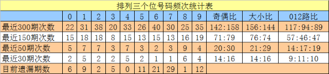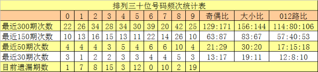 十位号码:前50期走势最活跃的号码为:8开出10个,6、7开出6个;走势最冷的号码为:3开出3个,0、1、2、5、9开出4个。十位号码012路比开出17:15:18,大小比开出30:20。本期十位排除两码:5、9,参考号码1、3、4,胆码关注4。