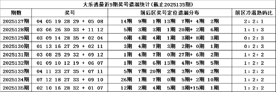 体彩大乐透第2025135期奖号为:02 10 16 28 32 + 01 07,各位号码遗漏期数分别为:12期、2期、4期、5期、3期+15期、1期,前区号码遗漏总期数为26期,012路比为0:3:2,奇偶比为0:5,没有开出重复号码。后区号码遗漏总期数为16期,和值为8,跨度为6。