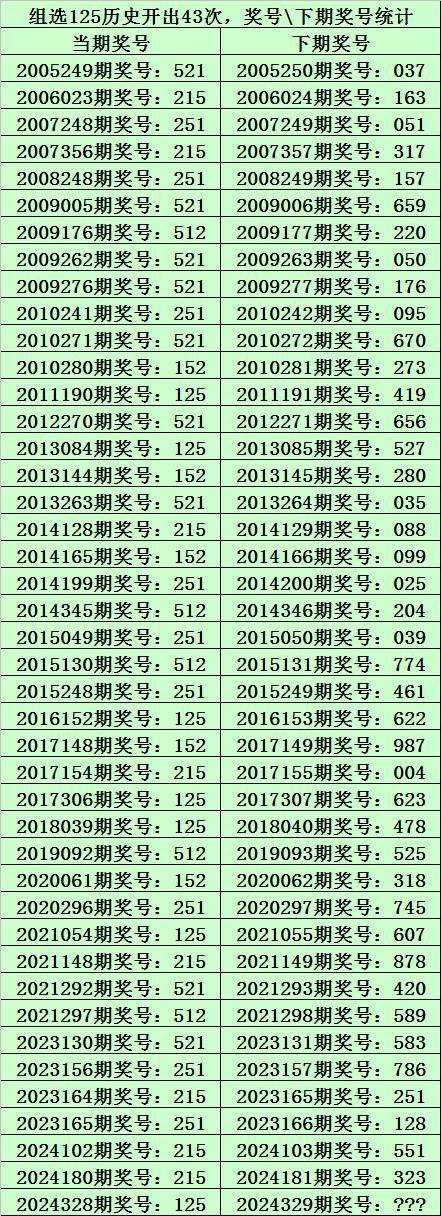 二、组选125分析:排列三历史上已开出43次组选号码125了,其奖号和下期开出奖号统计如下: