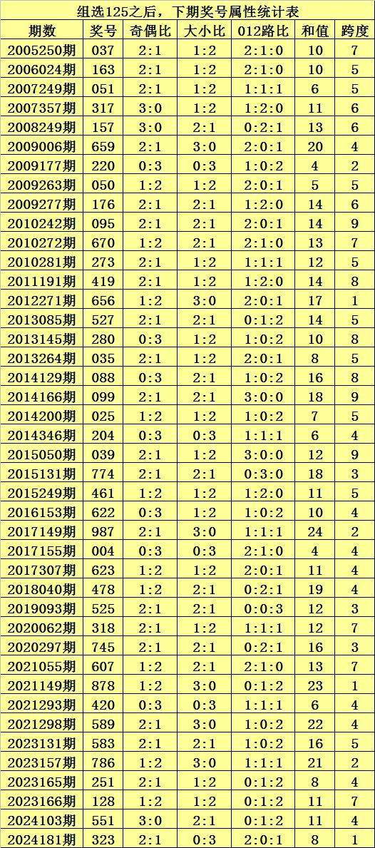 上期回顾:排列三第2024328期奖号为:125,类型:组六,历史上直选号码125出现了7次,组选号码125出现了43次。