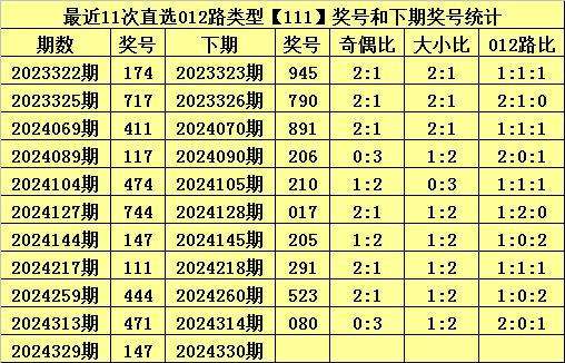 前10次直选111组合出现之后,其下期奖号分别为:945、790、891、206、210、017、205、291、523、080,其中奖号012路总比例为13:7:10,大小总比例为12:18,奇偶总比例为14:16。