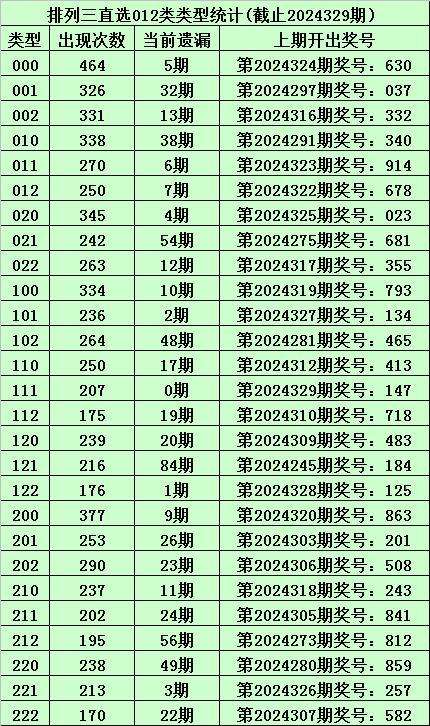 上期回顾:体彩排列三第2024329期开出奖号:147,其012路比为0:3:0,奖号012路类型为:111。
