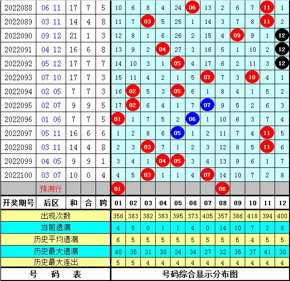 后区上期两码开出03和07,其号码遗漏值为1期+4期,本期后区重防冷码解冻,四码参考01、02、04、08,两码关注01和08。