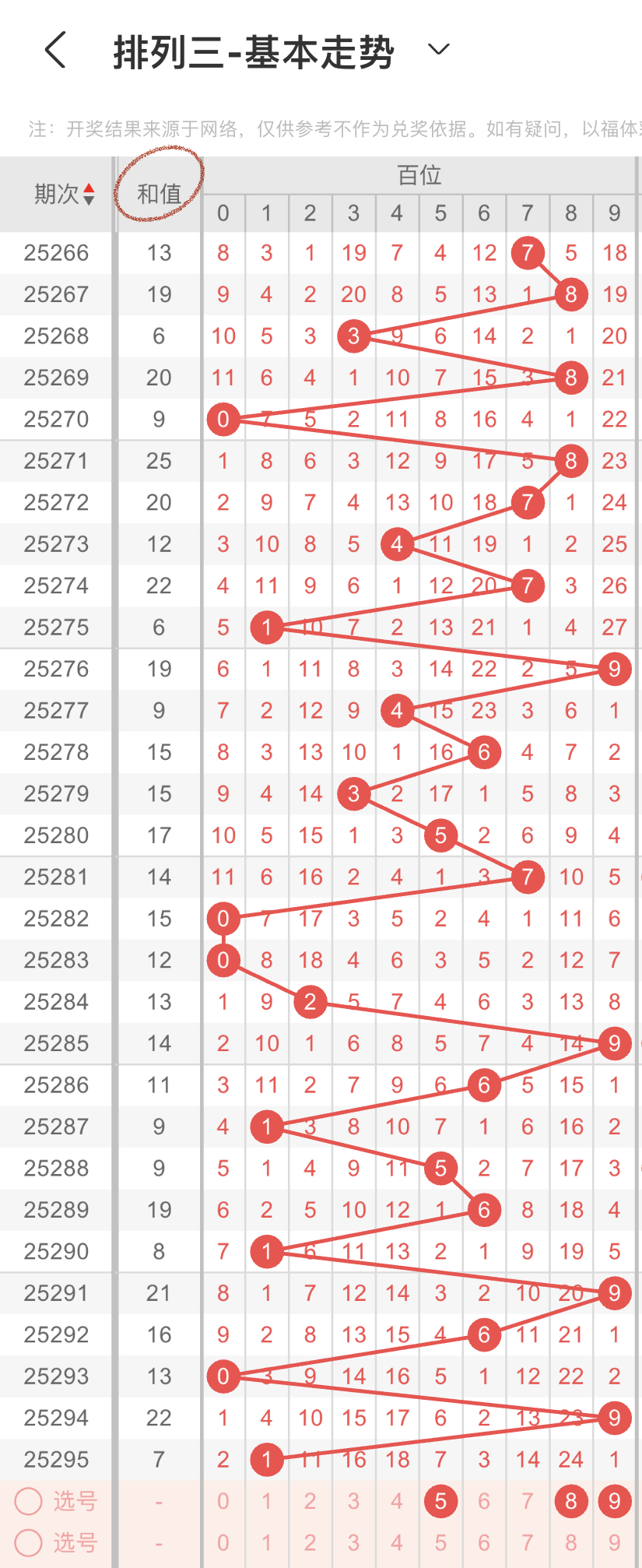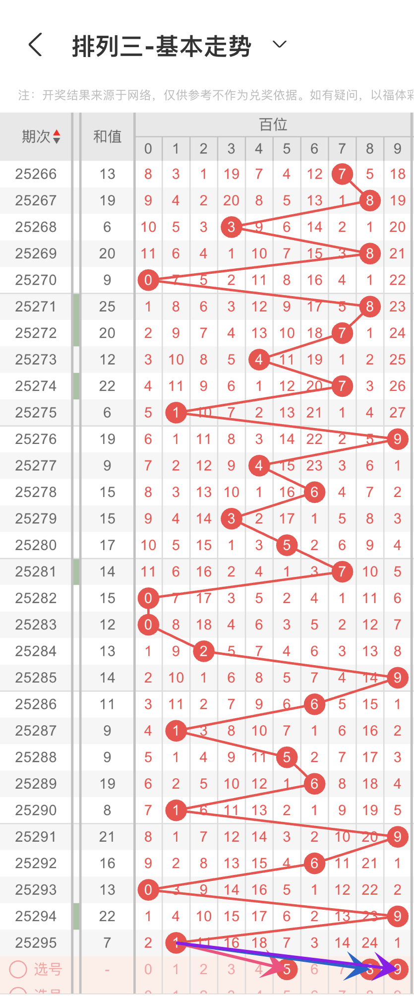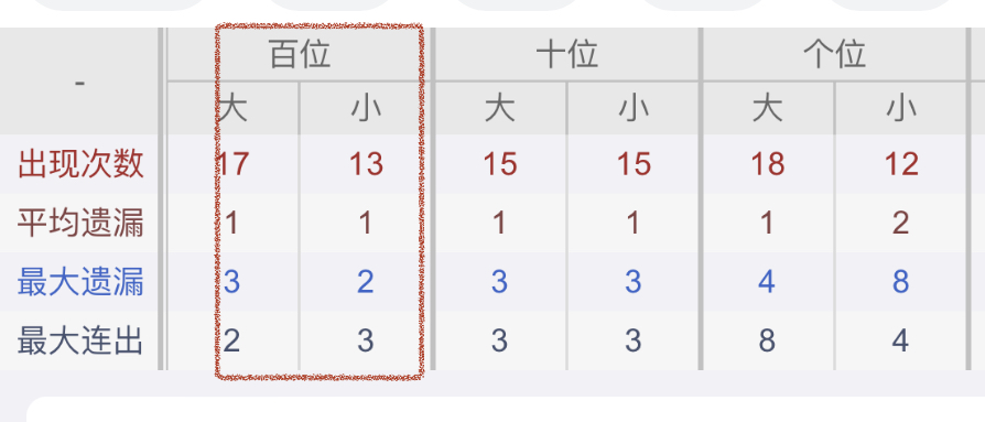 结合上面的大小、奇偶以及012路比,我们可以得到的数据分别是第一组56789,第二组13579,第三组0369,我们重点选择3组数据中重复的,那百位我们选择9,防2路的58,综上所述百位选589