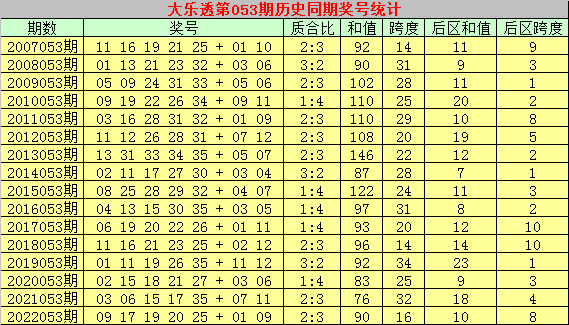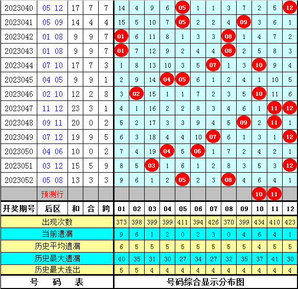 后区分析:在第053期历史同期开奖中,后区和值分别开出11、9、11、20、10、19、12、7、11、8、12、14、23、9、18、10,本期看好后区开出大和值,关注和值21。