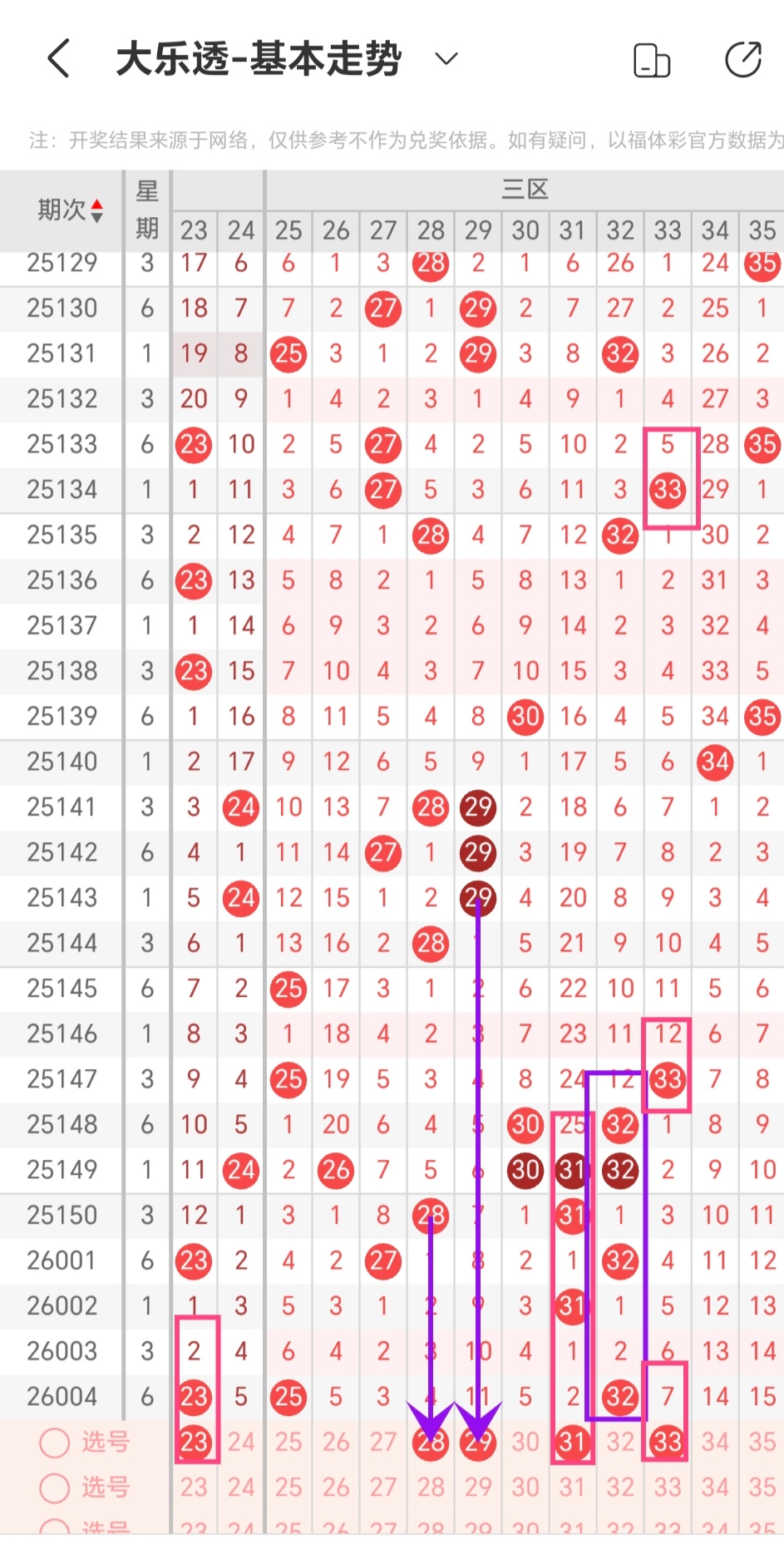 通过对同期次重号出现的数量规律进行统计分析,本期考虑出号0-1个,即05-06-08-31-32出号0-1个