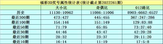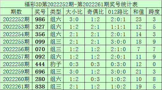 开奖回顾:福彩3D第2022261期奖号为838,其中奖号大小比为2:1,奇偶比为1:2,012路比为1:0:2,和值为19,跨度为5。