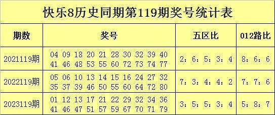 第1-4位号码分析:历史同期第119期出现范围在01-20区段,号码012路比为4:5:3,去年同期开出奖号:01+12+13+17,号码012路比为1:2:1。