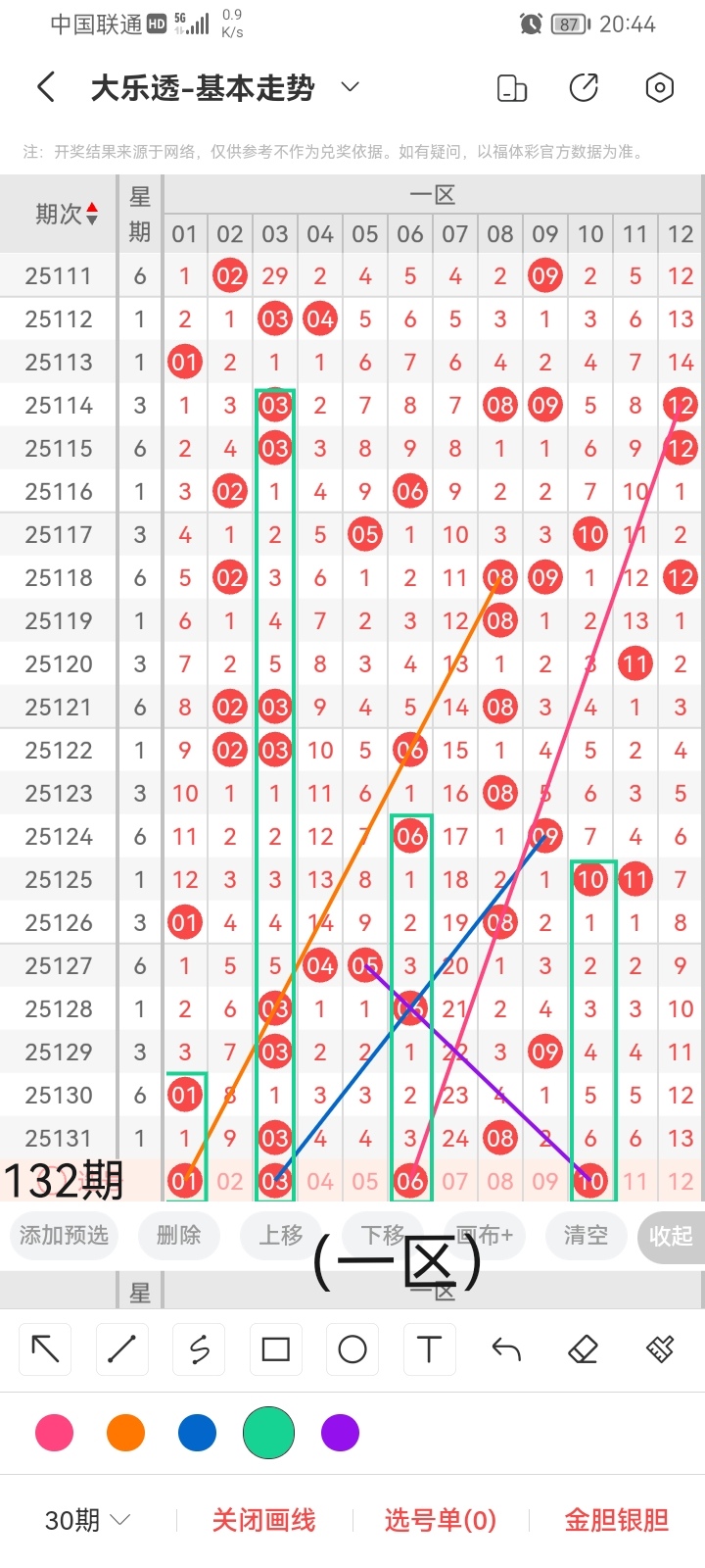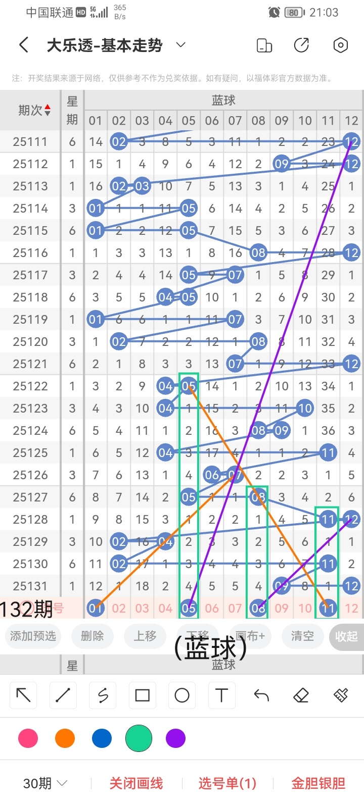小梁根据图中画线思路,最后给大家汇总提供一下大乐透本期红球、蓝球数据,供大家参考: