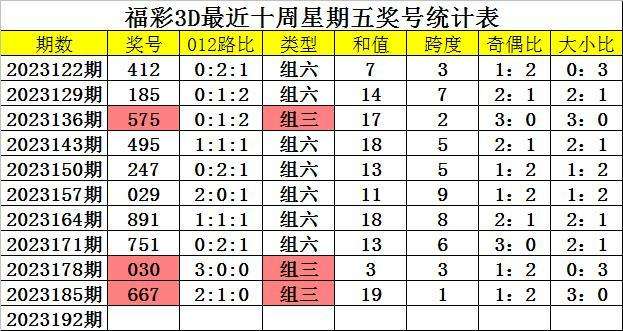 奖号类型分析:从近期周五开奖数据分析,组六近期热出,十周内出现7次,当前遗漏2周,组三出现3次,表现相对较冷,本周五预计继续开出组六号码。