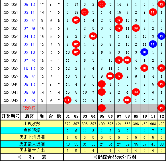 6。在历史同期奖号中,后区号码跨度分别为:4、2、3、8、5、6、2、11、5、3、3、7、6、5、9、3,开出范围在2-11区间,本期后区关注跨度7。