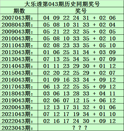 黑天鹅大乐透第2023043期历史同期奖号分析