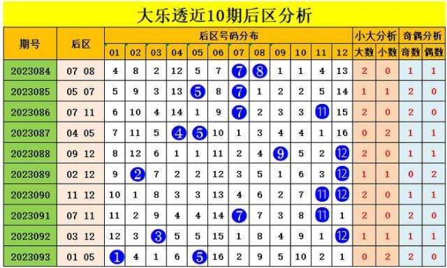后区近10期大小比为13:7,大号码走势较热,上期开出小小组合,本期后区推荐小小组合;