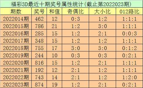 开奖回顾:第2022023期福彩3D奖号为874。奖号形态为组六,大小比为2:1,和值为19,奇偶比为1:2,012路比为0:2:1,跨度为4。