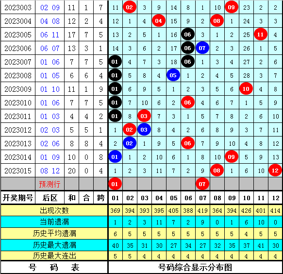 前区龙头分析:前9个周星期三龙头号码分别开出:05、10、01、15、11、01、04、05、01,龙头出现范围在01-15之间,本期看好龙头继续在01-15之间出现。