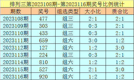 上期回顾:排列三第2023116奖号开出920,奖号质合比为1:2,大小比为1:2,跨度为9,类型为组六。