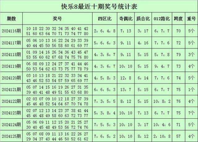 福彩快乐8第2024125期开奖回顾:05 07 08 09 11 13 16 22 26 27 29 34 37 43 44 46 50 52 61 62,其中奖号四区比为7:6:5:2,奇偶比为10:10,质合比为8:12,跨度为57,012路比为2:10:8,开出4个重号:05、09、11、27。